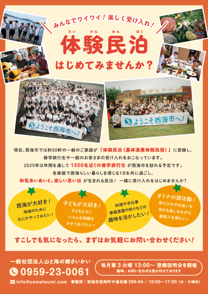 現在、山と海の郷さいかいでは、一緒に体験民泊をスタートしてくださる家庭を募集しています!